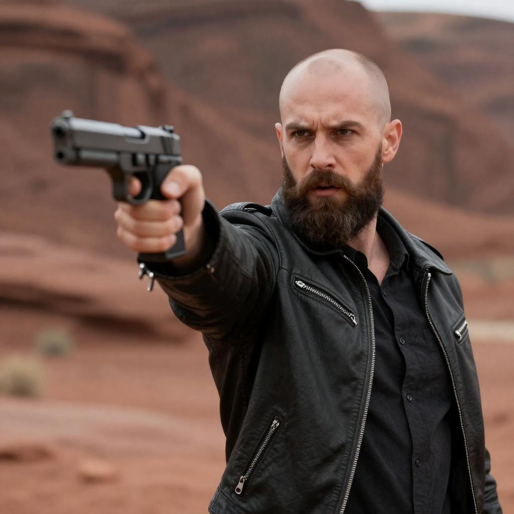 Photograph of a bald, middle-aged man with a beard, wearing a dark jacket, aiming a black assault rifle with a red dot sight and yellow-tipped bullets. He is in a dimly lit, urban environment with blurred, colorful lights in the background. His intense expression suggests focus and readiness.