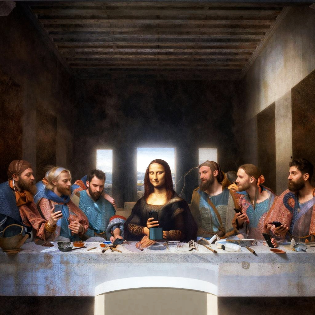 Realistic photo.Photorealistic photo of Leonardo da Vinci's The Last Supper with a contemporary twist, depicting the disciples using smartphones at the table. Photo capturing the essence of da Vinci in a realistic, modern photo style, blending classic art with a fresh, updated feel. realistic photo