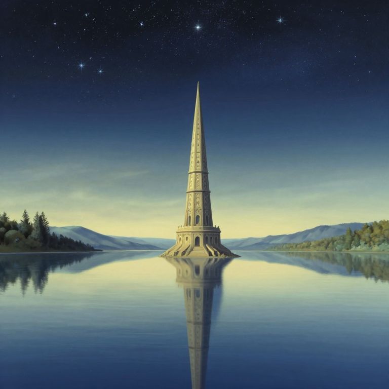 Craft an image in the whimsical, surrealistic style reminiscent of Dali's iconic works, portraying a serene lake that mirrors an ethereal vista, with a colossal, minutely detailed tower emerging from its heart. This fantastical scene should be observed from beneath at a low angle, under a canopy of twinkling stars, invoking a sense of astonishment and reverence for the interconnection between time and nature. The dreamlike ambiance is further accentuated by gentle, diffused lighting that bathes the scene in an unearthly radiance, casting elongated shadows across the water's surface and creating a delicate equilibrium between reality and fantasy.
