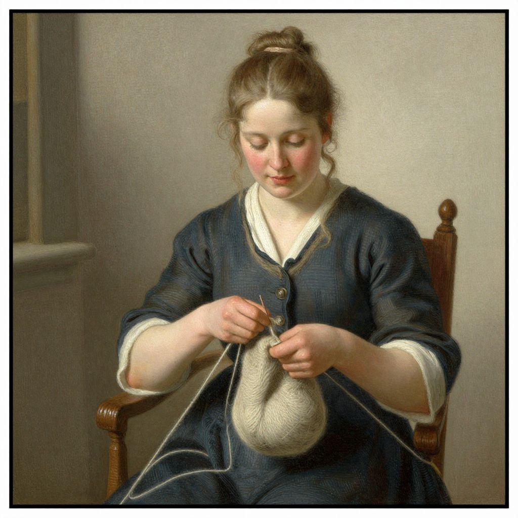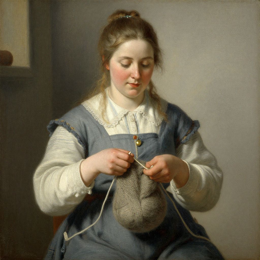 This is a detailed, digital painting of a young Caucasian woman with fair skin and brown hair, tied back with a ribbon. She is wearing a blue, puffed-sleeve dress over a white, lace-trimmed blouse. She is seated and focused on knitting a gray fabric using a wooden needle. Her cheeks are slightly rosy, and she has a serene expression. The background is a simple, muted gray, with a small, indistinct frame visible on the left. The textures of the fabric and her clothing are rendered with realistic detail, emphasizing the softness of the knit and the delicate lace.