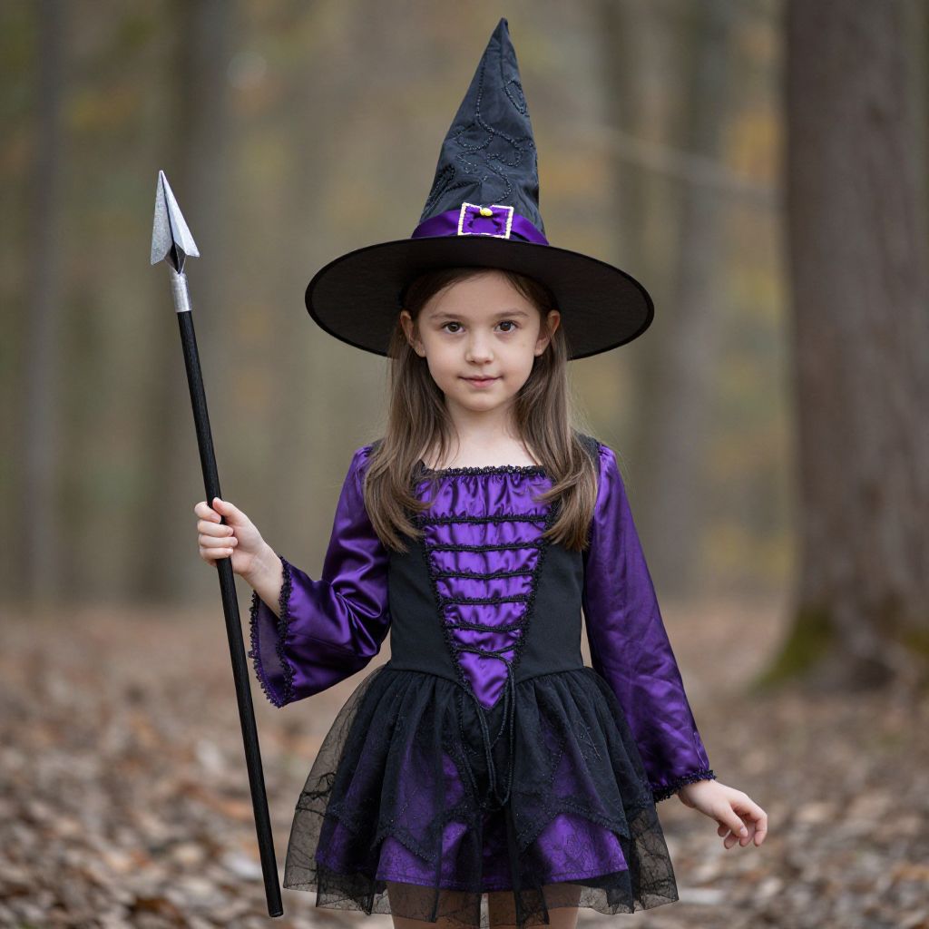 Photograph of a young girl in a purple and black witch costume with a pointed hat, holding a black wand, standing in a forest with fallen leaves