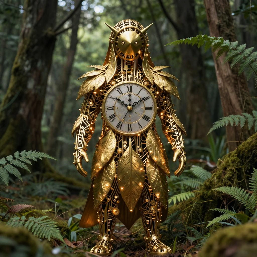 Inspired by the works of Eugène Grasset, a clockwork forest guardian adorned with stylized brass leaf-lattice woven with glowing microcircuit traces, illustrating the seamless connection between nature and technology in a captivating art nouveau style.