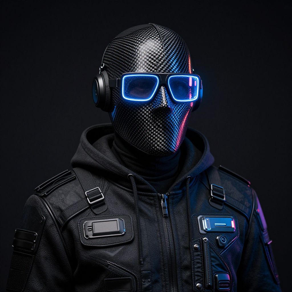 Photograph of a person wearing a black, textured, carbon-fiber face mask with glowing blue square sunglasses and black headphones. They are dressed in a black, leather-like jacket with multiple pockets, one of which has a blue LED light. The background is completely black, emphasizing the bright blue light from the glasses and LED pocket. The person's identity is concealed, and the image has a futuristic, cybernetic style. The lighting highlights the mask's texture and the jacket's details, creating a high-contrast, modern aesthetic.