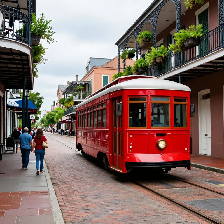 A vibrant red streetcar glides along brick-paved tracks in a historic New Orleans neighborhood. The scene includes colorful buildings with wrought iron balconies decorated with lush green plants. Pedestrians stroll on the sidewalk beneath ornate awnings, capturing the charm of the city's architecture and street life.