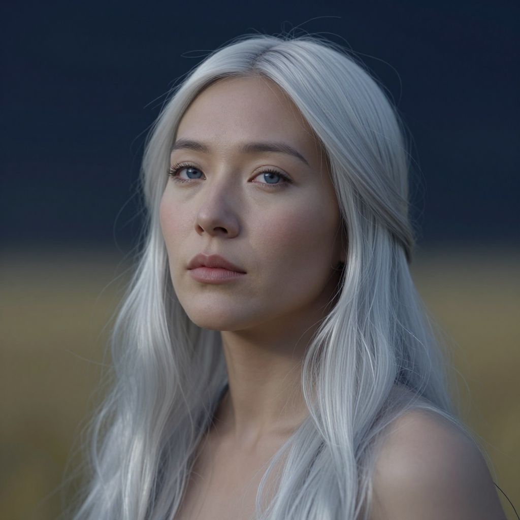 Photograph of a young woman with long, silver-white hair, light skin, and blue eyes, set against a dark blue and golden background.