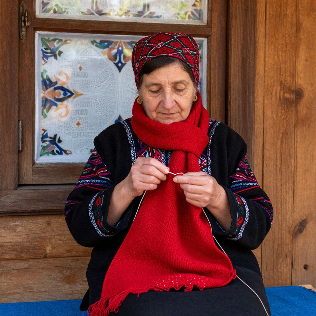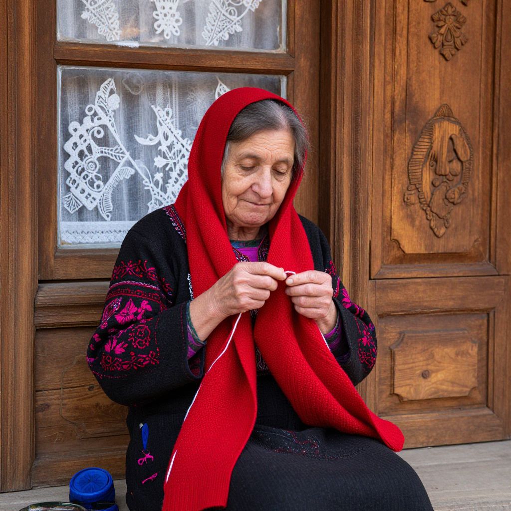 Elderly woman engrossed in knitting a vibrant red scarf, seated by a wooden window with intricate Balkan-inspired patterns adorning her traditional attire, evoking the warmth of a Bulgarian village home in Delchevo.