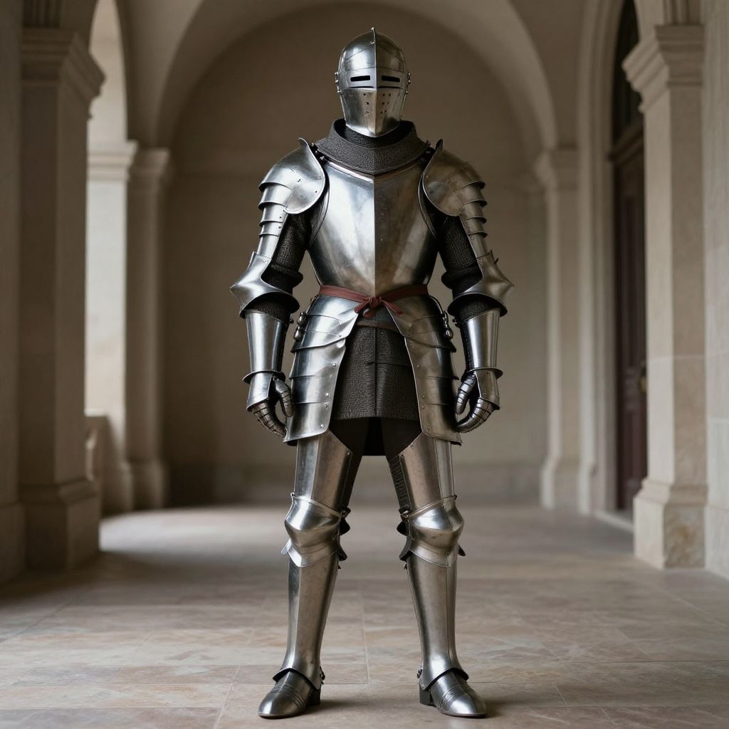 Photorealistic CGI of a fully armored knight standing in a medieval stone corridor with arched doorways, wearing shiny silver armor.