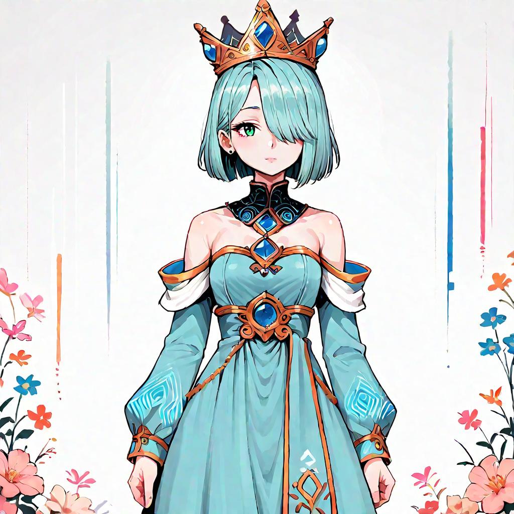 Score_9, score_8_up, source_anime, 1girl, RslnDef, crown, bare shoulders, off-shoulder dress, long sleeves, blue dress, long dress, aqua dress, cowboy shot, hair over one eye