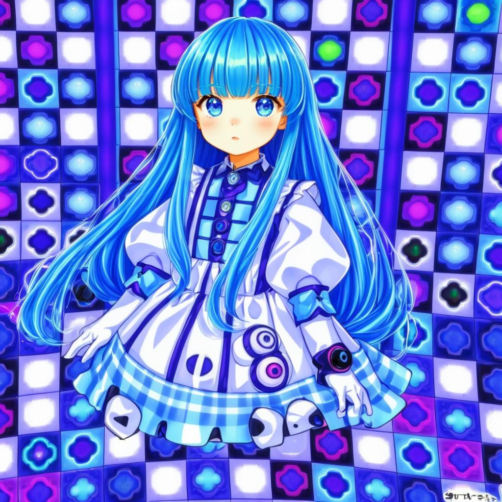 Digital anime illustration of a girl with long blue hair and bright blue eyes, wearing a white dress with blue accents and checkered patterns. She is posed against a vibrant background featuring a grid of colorful, glowing floral shapes in blue, purple, and green hues. The girl has white gloves and an expressive, thoughtful look.