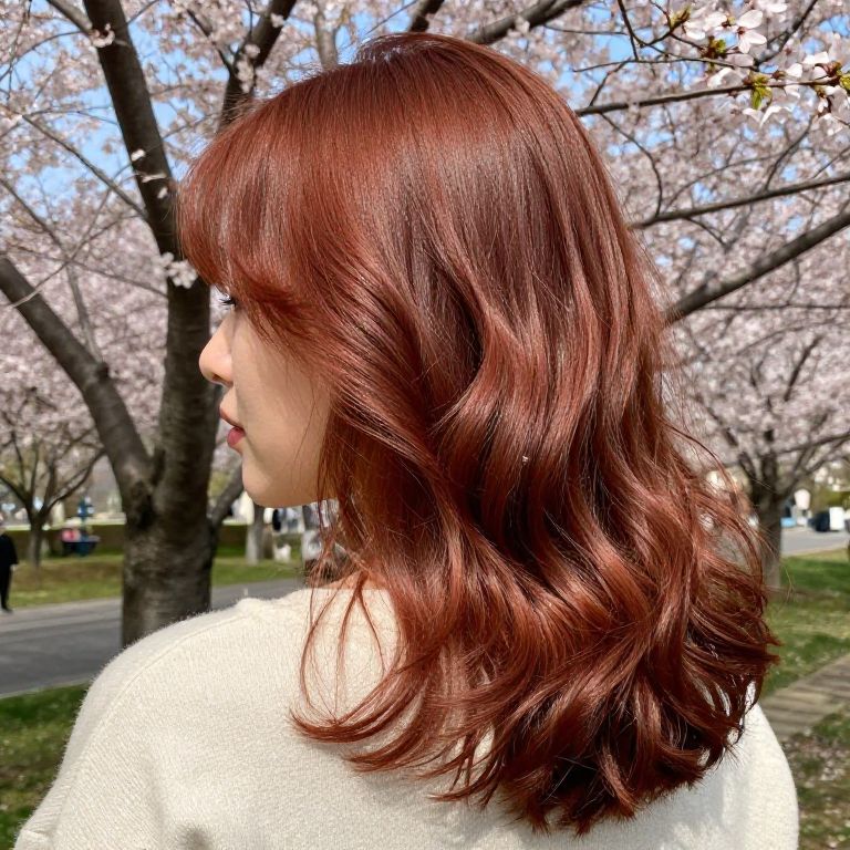 Comma haircut on flowing chestnut hair, gentle curls shaped into a comma at the nape of the neck, soft sunlight illuminating the strands, casual outdoor setting with blossoming cherry trees, serene expression, warm color palette, realistic style.