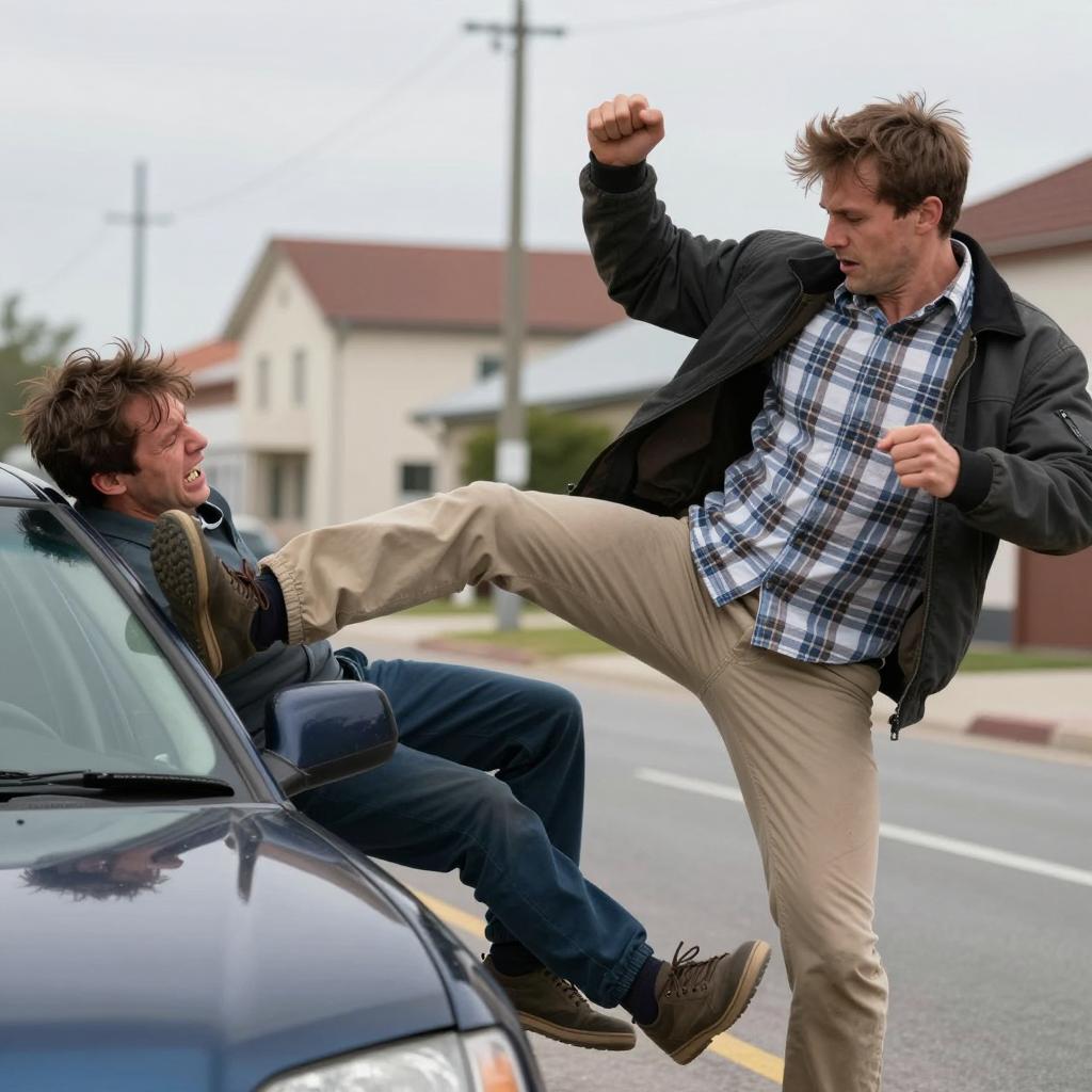Two men in a vintage car. Driver with short dark hair, light skin, wearing a gray shirt, holding the steering wheel. Passenger with dark hair, light skin, wearing a beige coat, looking tired. Car window in foreground. Driver's expression focused, passenger's expression neutral. Two visible hands, one on steering wheel, one on seat.