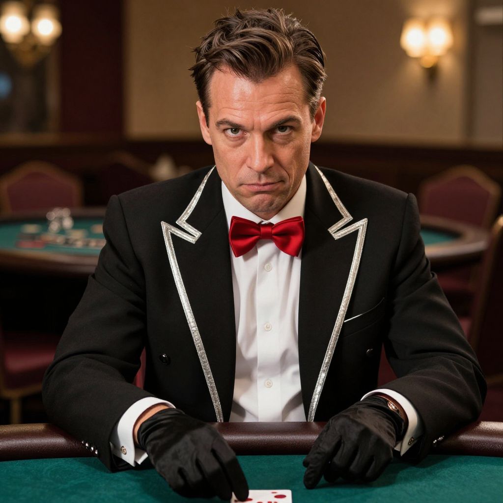 A close-up portrait of a man in flashy casino costume attire, including a full-body black tuxedo with silver trim, a custom tailored jacket, red bowtie, and black gloves, seated at a blackjack table in a high-end casino lounge, his face is chiseled with a focused and slightly mischievous expression, golden hour lighting casting subtle shadows
