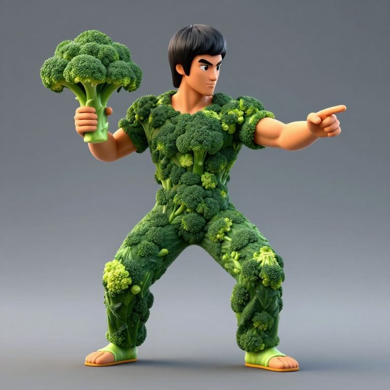 The image is a 3D rendering of a Bruce Lee made up of broccoli, He is in a fighting stance, with his arms stretched out to the sides and his legs bent at the knees, He is holding a bunch of broccoli in his right hand and his left hand is pointing towards the right side of the image, The broccoli is a bright green color and appears to be fresh and healthy, The background is a matte gradient of colorful gray, making him and the broccoli stand out