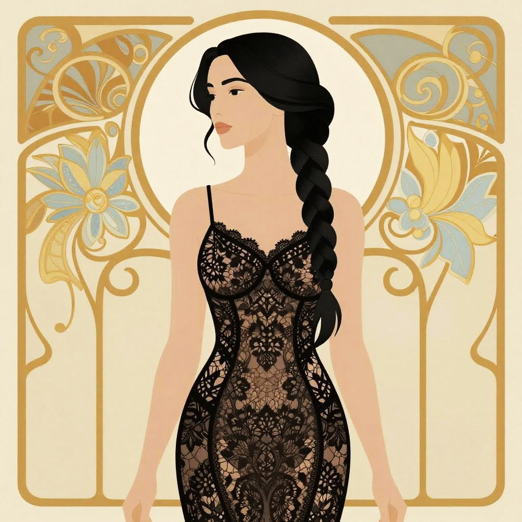 A stylized portrait of a woman with long braided black hair wearing an intricate black lace dress, standing against an ornamental art nouveau background with circular and floral patterns, elegant decorative style, flat shading, muted warm beige and gold colors with black and soft blue accents