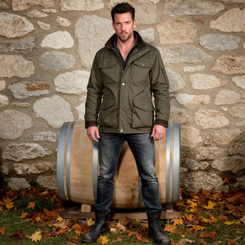 Photograph of a bearded man with short dark hair and a rugged appearance, standing in front of a stone wall. He wears a dark green, buttoned-up, hooded jacket with pockets, dark blue jeans, and black boots. He is leaning slightly against a large wooden barrel with metal bands, which is placed on the ground. The stone wall behind him is textured and uneven, and the ground is covered with autumn leaves in shades of brown, orange, and yellow. The lighting is bright, highlighting the man and the barrel, creating a contrast with the shadowed background.