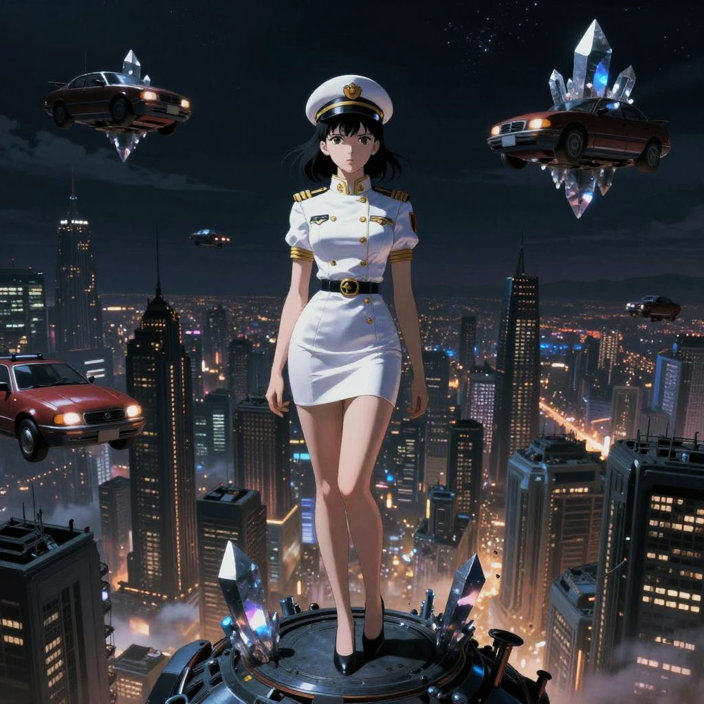 A realistic anime-style image of a female captain in a white uniform with a miniskirt, standing on a futuristic platform illuminated by glowing dark matter crystals. The background features a sprawling cityscape at night with skyscrapers and flying cars. The scene blends surreal and sci-fi elements, emphasizing a mysterious and fantastic atmosphere.