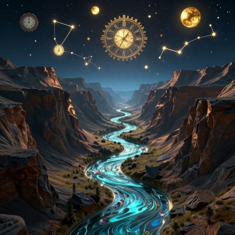 A surreal 3D-rendered landscape features a meandering river of molten glass flowing upward through a dreamlike canyon, illuminated by a celestial sky adorned with floating clockwork constellations and golden orbs, creating ever-shifting mosaics of light and shadow that evoke themes of time and memory.