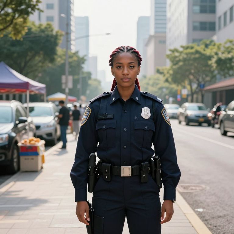 A confident female police officer with sleek, vibrant braids in her hair, wearing a modern, well-fitted uniform with a bold badge on her chest, standing in a sunlit city street with a warm, natural light. She has a friendly yet professional expression, her eyes sharp and attentive, exuding authority and warmth. The background features a bustling neighborhood with colorful buildings and pedestrians, adding a sense of realism and life to the scene.