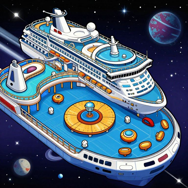 Colorful, cartoon-style illustration of a large, white cruise ship with multiple decks, pools, and orange circular water features, floating in a starry