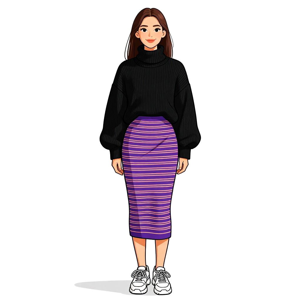 Woman with pretty face and pretty hair. smiling Woman, modern casual, oversized black ribbed turtleneck sweater, midi-length tube skirt with horizontal multicolor stripes, white chunky sneakers, minimal makeup, straight hair parted in the middle, plain white studio background. --sref 1467