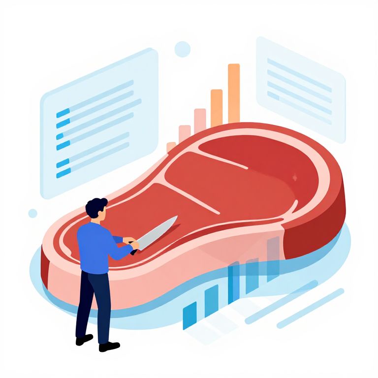 Steaking definition illustrated as a modern infographic, showing a business professional slicing through a giant steak to reveal layers of data and charts, vibrant colors, clean lines, futuristic style, digital art.