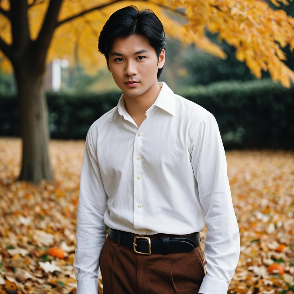 Prince eric halloween ,1boy, male focus, solo, realistic, shirt, pants, long sleeves, looking at viewer, brown pants, belt, blurry background, blurry, white shirt, outdoors, closed mouth, standing, autumn leaves, black hair, collared shirt, asian