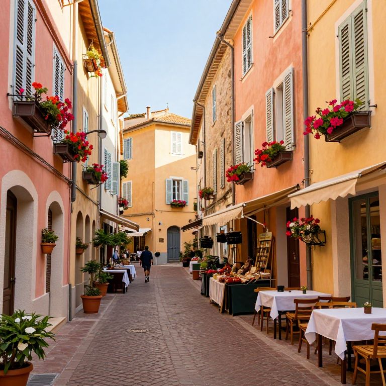 French Riviera old town street view, narrow winding alleys lined with vibrant flower boxes, pastel-colored buildings with decorative shutters, cobblestone streets bustling with local markets and cafes, warm afternoon light enhancing charming coastal village vibe