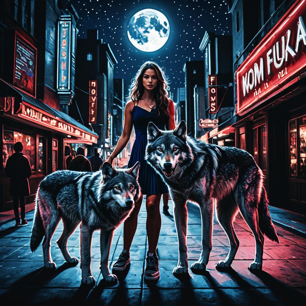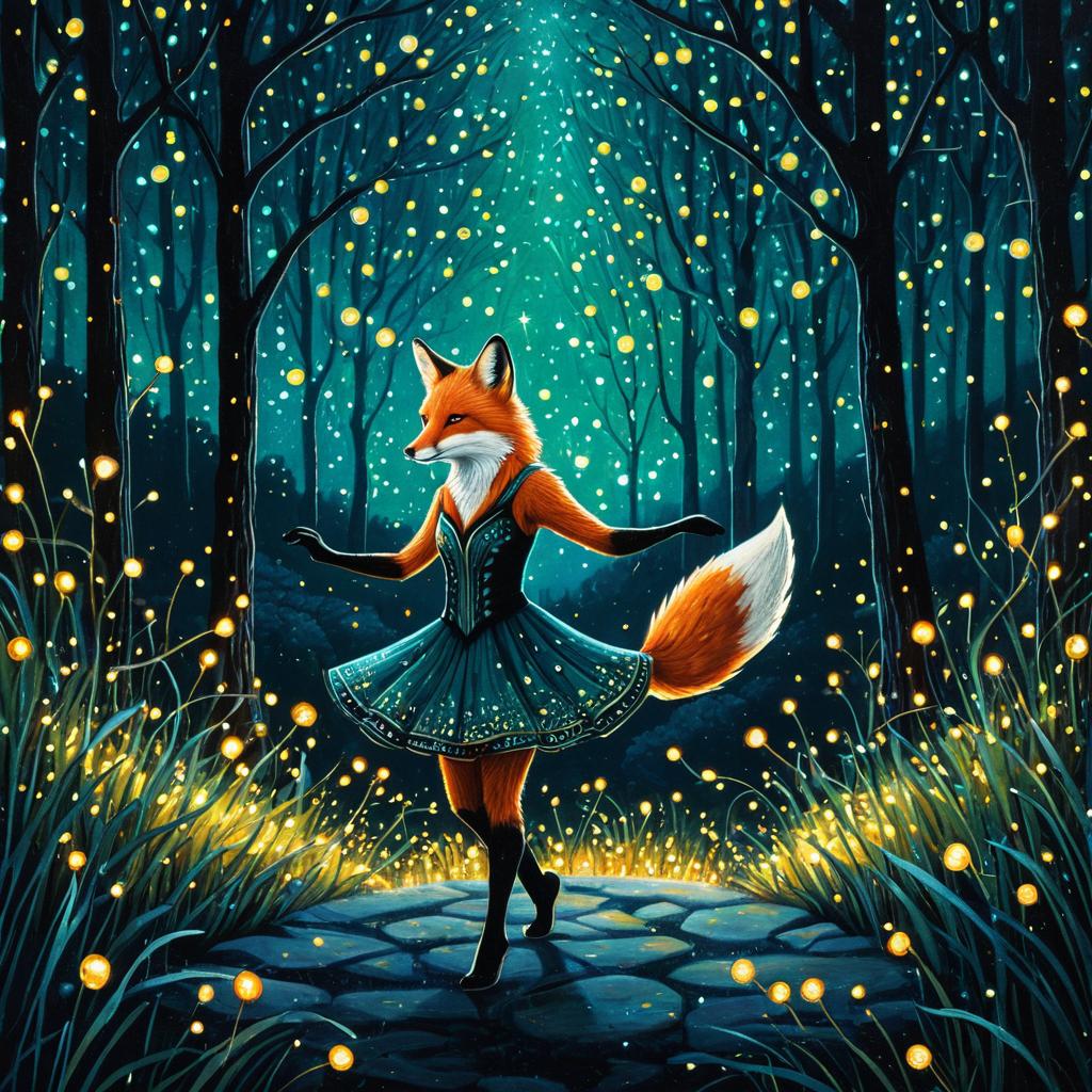 A fusion of a fox and a dancer in a standing pose, surrounded by five glowing fireflies against a nightlife backdrop. The artwork is accented with hints of silver, indigo, and emerald, adding warmth and depth to the scene. Rendered in a stylized, nighttime setting, the composition captures a surreal yet lively atmosphere, with intricate details highlighting the fusion character and the playful nature of the accompanying fireflies.