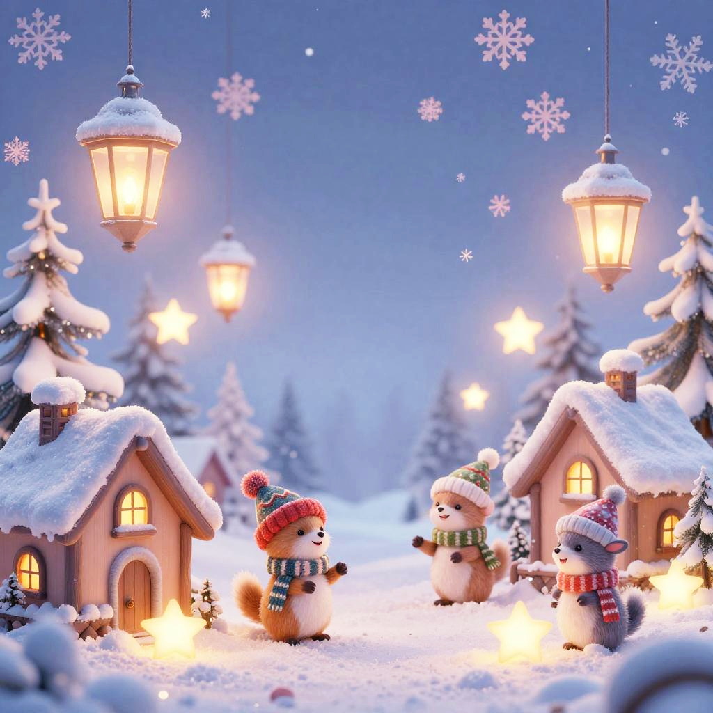Whimsical Christmas background showcasing a fantasy winter wonderland with floating lanterns, sparkling snow-covered cottages, smiling animals in festive hats, glowing Christmas stars, and swirling pastel-colored snowflakes creating a dreamy holiday atmosphere.