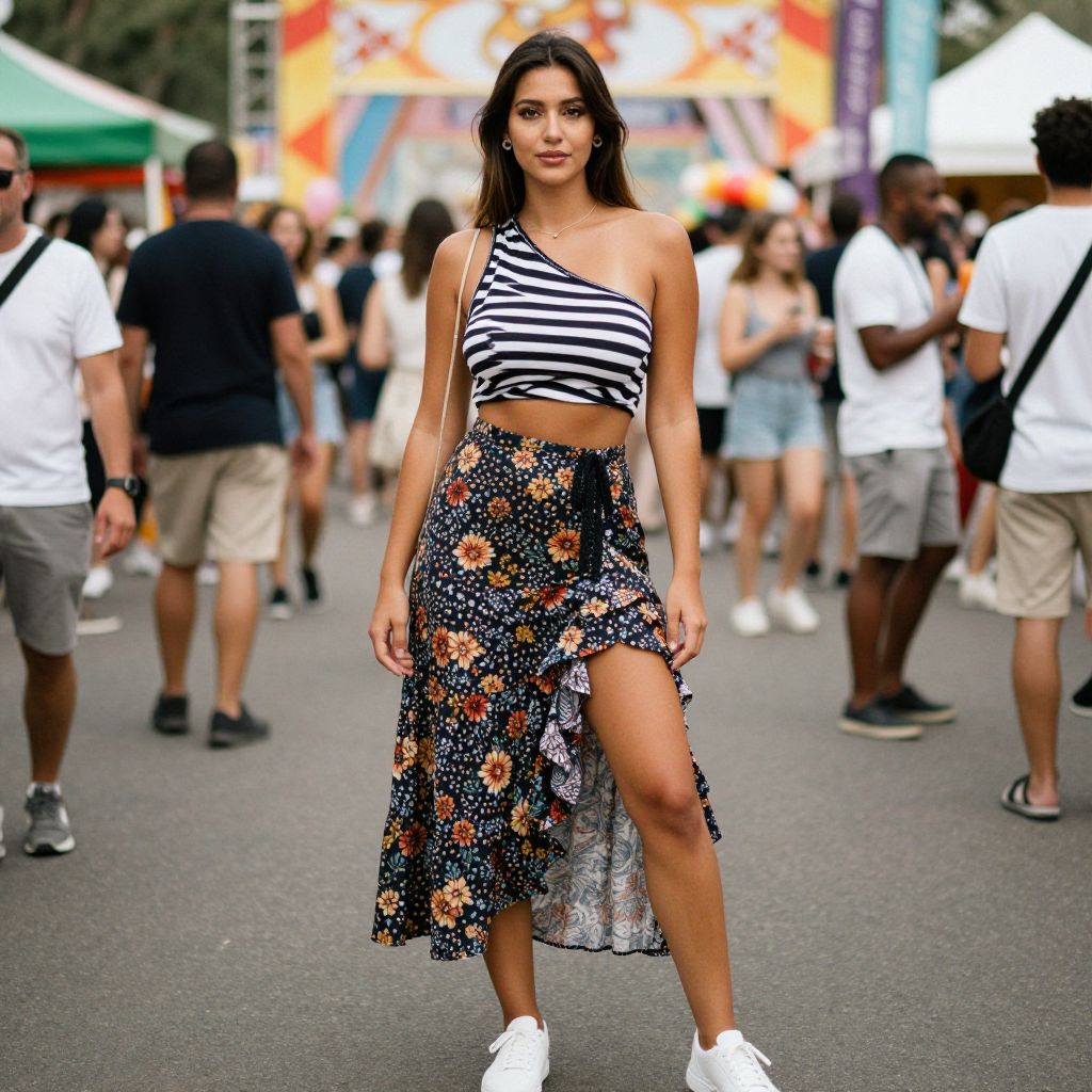 Photograph of a young woman walking down a bustling street at an outdoor event. She has long, dark hair and a medium tan skin tone. She's wearing a black and white striped, one-shoulder crop top and a high-waisted, floral-patterned skirt with a high slit on her right side. She pairs this with white sneakers. The background is filled with a crowd of casually dressed people, some in T-shirts and shorts, and colorful tents. Bright, blurred banners and lights are visible in the distance, adding a festive atmosphere. The image has a vibrant, slightly exaggerated color style.