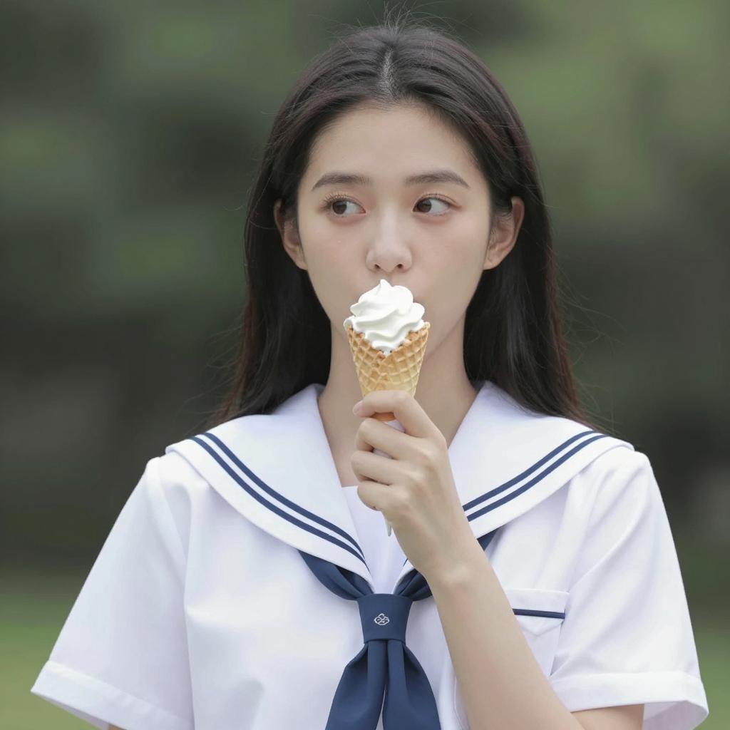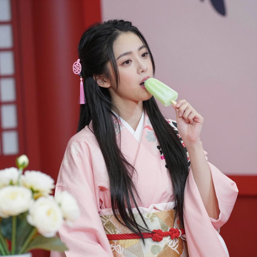 Asian woman with long black hair, wearing pink and black kimono, eating green popsicle. Pink hairpin in her hair. White floral arrangement in foreground. Pink and red patterned obi sash. Blurred red and pink background. Seated position, right arm raised, holding popsicle near mouth.