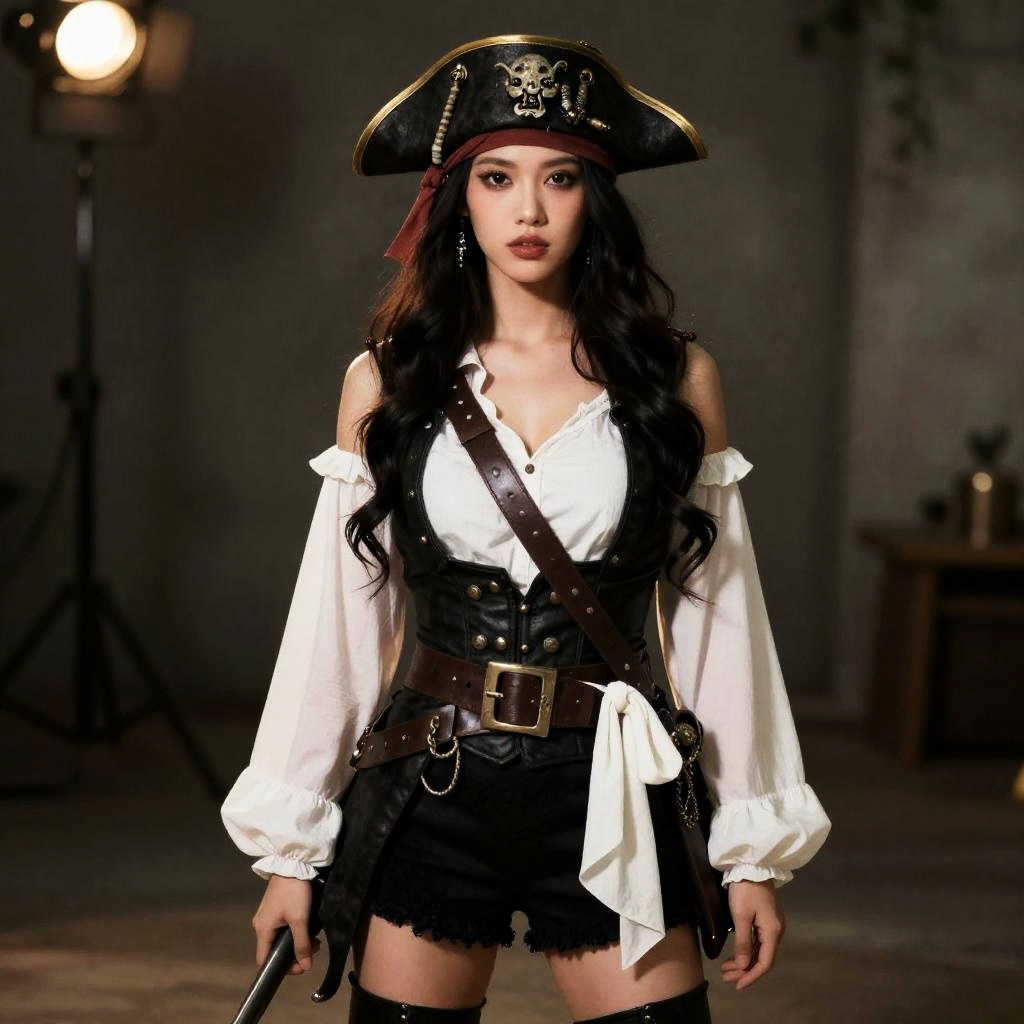 Pirate Wench Outfit, pirate woman in a black and white outfit posing for a picture