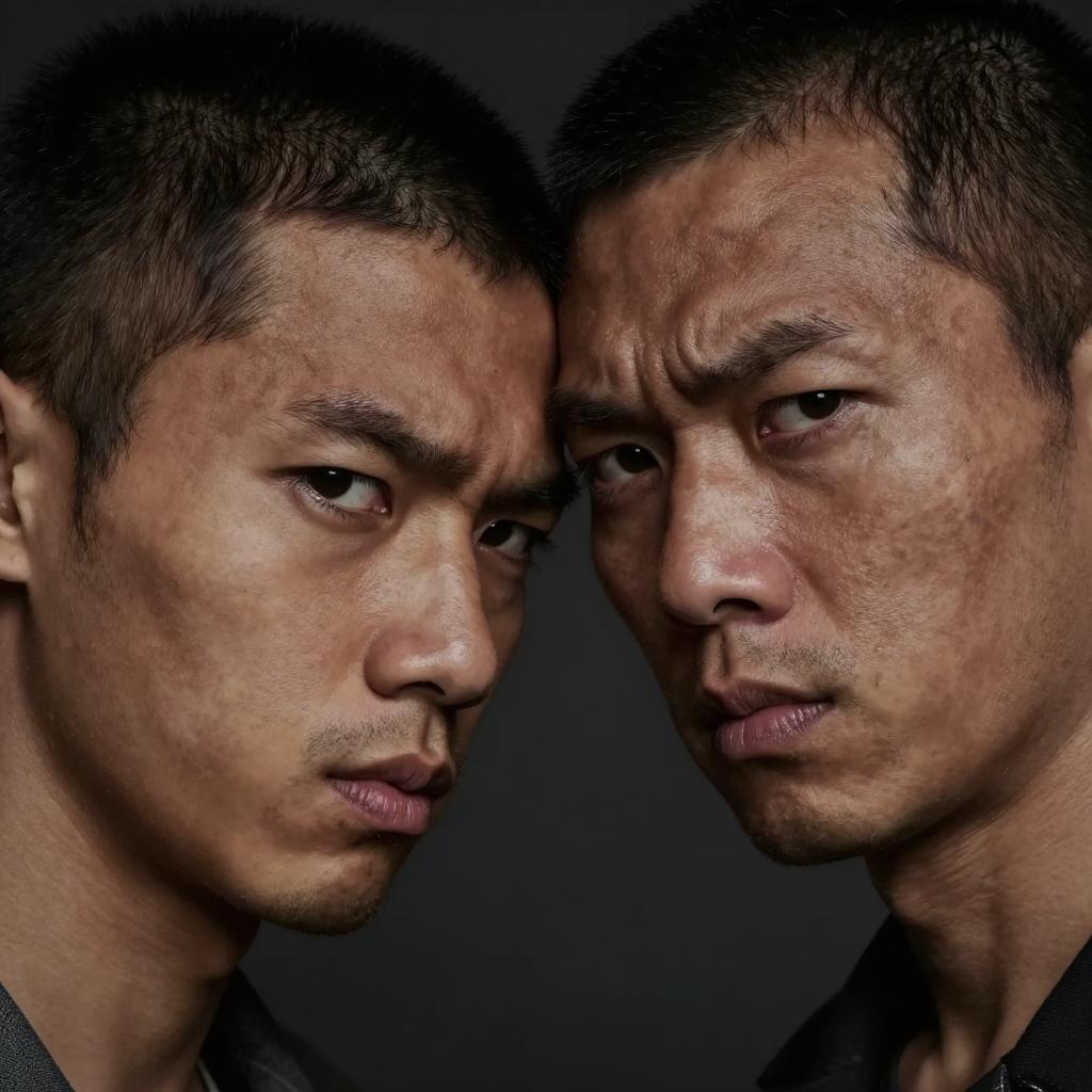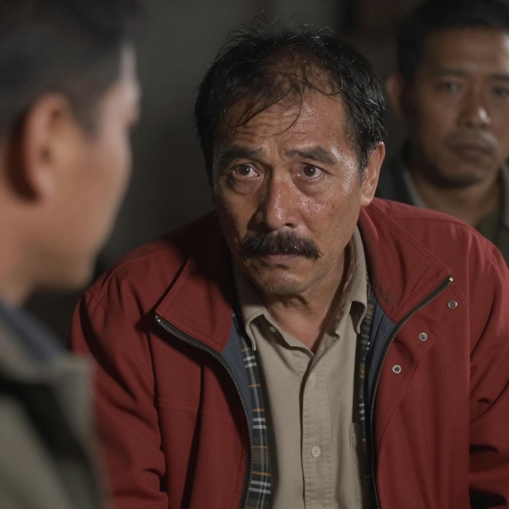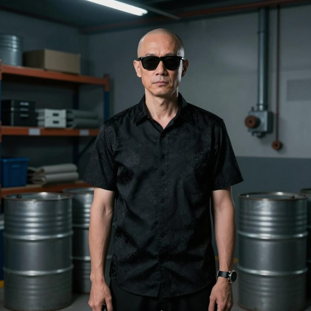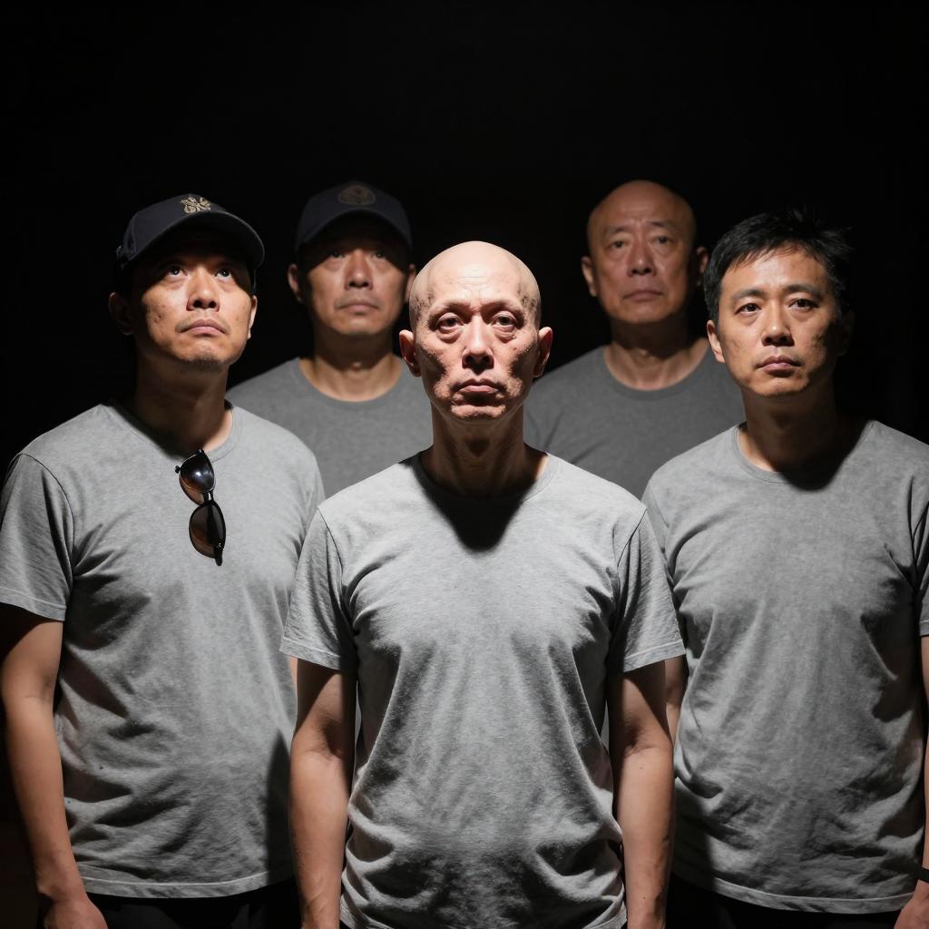 Five Asian men standing in dim lighting with a dark background. The man in the center is bald with an elongated face and wears a gray t-shirt. Two men on the left wear caps, with one holding sunglasses on his shirt, looking upward. The man on the right looks straight ahead, and one in the back wears a cap and looks slightly to the side. All men wear gray shirts, and shadows dominate the image.