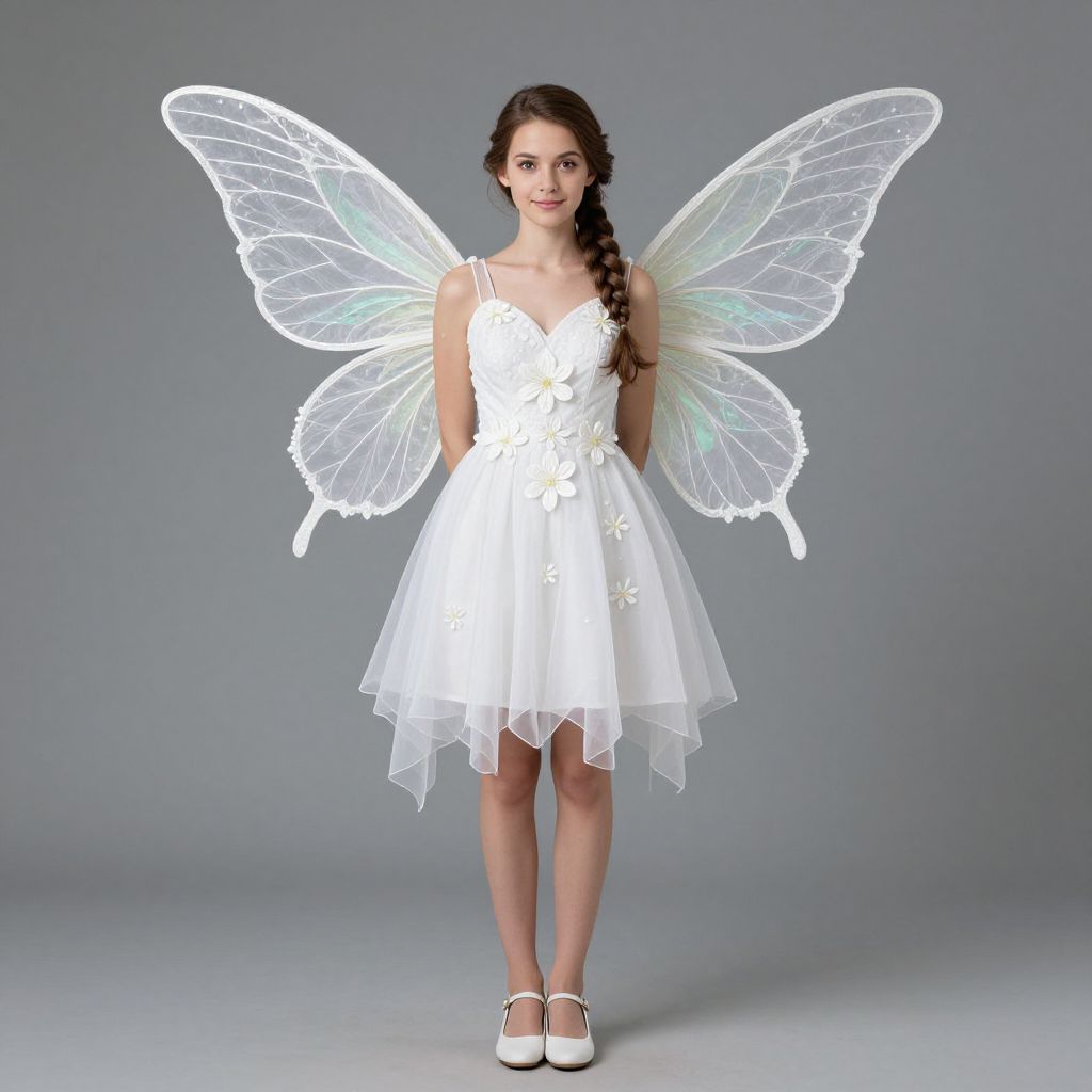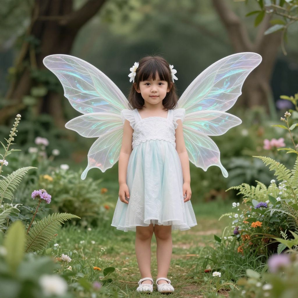 Photograph of a young girl with straight brown hair, wearing a black dress, and large, colorful butterfly wings in orange, teal, and white.