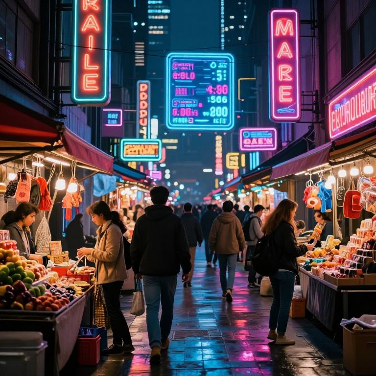 A vibrant, nighttime photograph of a bustling urban market street illuminated by neon signs in various colors (red, blue, pink, and yellow). The scene features diverse shoppers, including a woman in a beige coat and a man in a black jacket, walking between stalls displaying fresh produce, fruits, and vegetables. Neon signs for "RALE," "MAE," and "GARDENER" hang above, with a digital price board in the background. The street is wet, reflecting the neon lights, adding to the lively, colorful atmosphere. The image captures a mix of modern and traditional market elements.