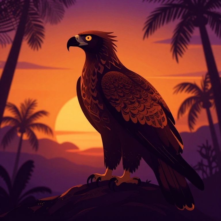 Digital illustration of a majestic hawk with detailed brown and red feathers, standing on a rock against a vibrant orange sunset and silhouetted palm trees.