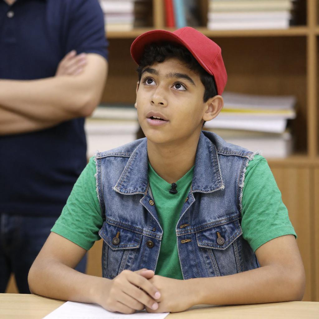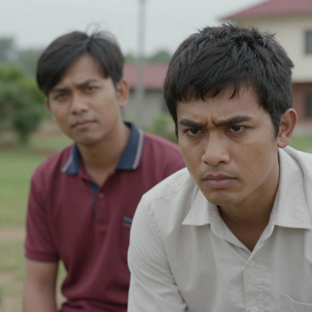 Photograph of a young man with a wide-brimmed green hat, green and yellow striped shirt, and yellow t-shirt, pointing upwards with a surprised expression. A blurred figure is partially visible behind him. Bright white sky in the background.