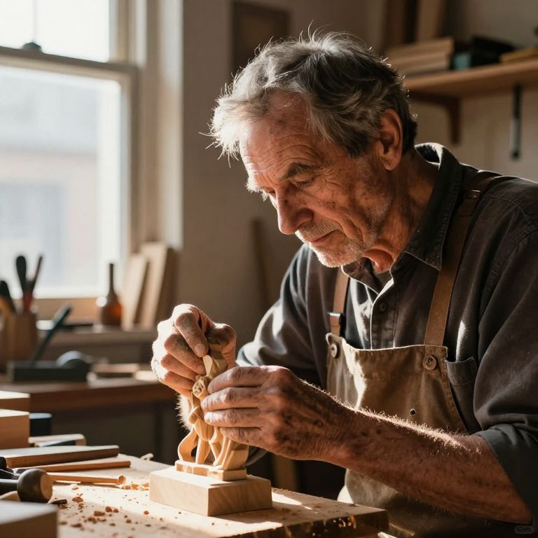 Imagine a captivating portrait of a seasoned woodworker bathed in warm sunlight streaming through an adjacent window, casting a gentle shadow across their weathered face. Their hands, marked by calluses and paint stains, skillfully cradle an intricate wooden sculpture, bringing it to life under the light's embrace. As they concentrate intently on their creation, their eyes exude a profound passion for their craft. The room surrounding them is filled with tools and unfinished projects, hinting at a lifetime dedicated to craftsmanship and artistry. This intimate scene captures not only the artist's deep connection to their work but also the transformative power of light in illuminating the soul of a master craftsman.