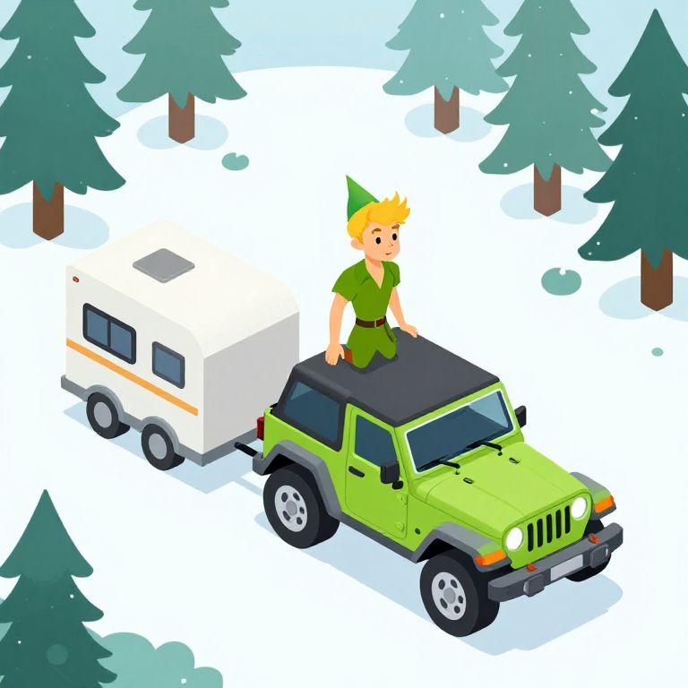 This digital illustration in a colorful, cartoon style depicts a green Jeep with a white trailer hitched to its back. A pixelated, blonde, green-clad, pointy-eared character resembling Puck from "A Midsummer Night's Dream" stands on the Jeep's roof. The background features a snowy forest with stylized, green pine trees and a clear, light blue sky. The Jeep has black tires and a black roof, with the trailer featuring a single window and orange stripe. The character wears a green tunic and hat, adding a whimsical touch to the winter scene.