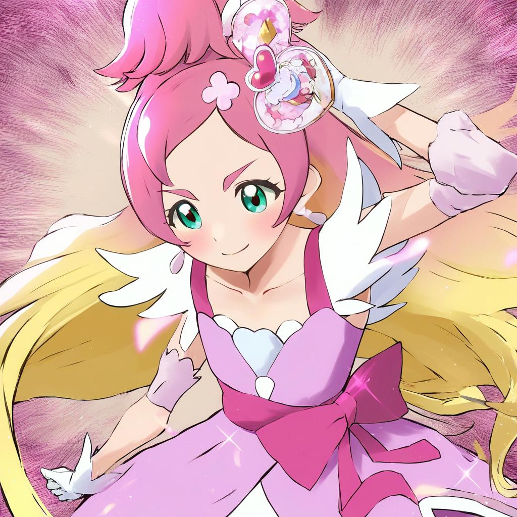 Haruno haruka, precure, 1girl, green eyes, blue eyes, blonde hair, pink hair, long hair, two-tone hair, streaked hair, gradient hair, white gloves, waist bow, pink bow, magical girl, magical girl, by artist owa (ishtail), leet