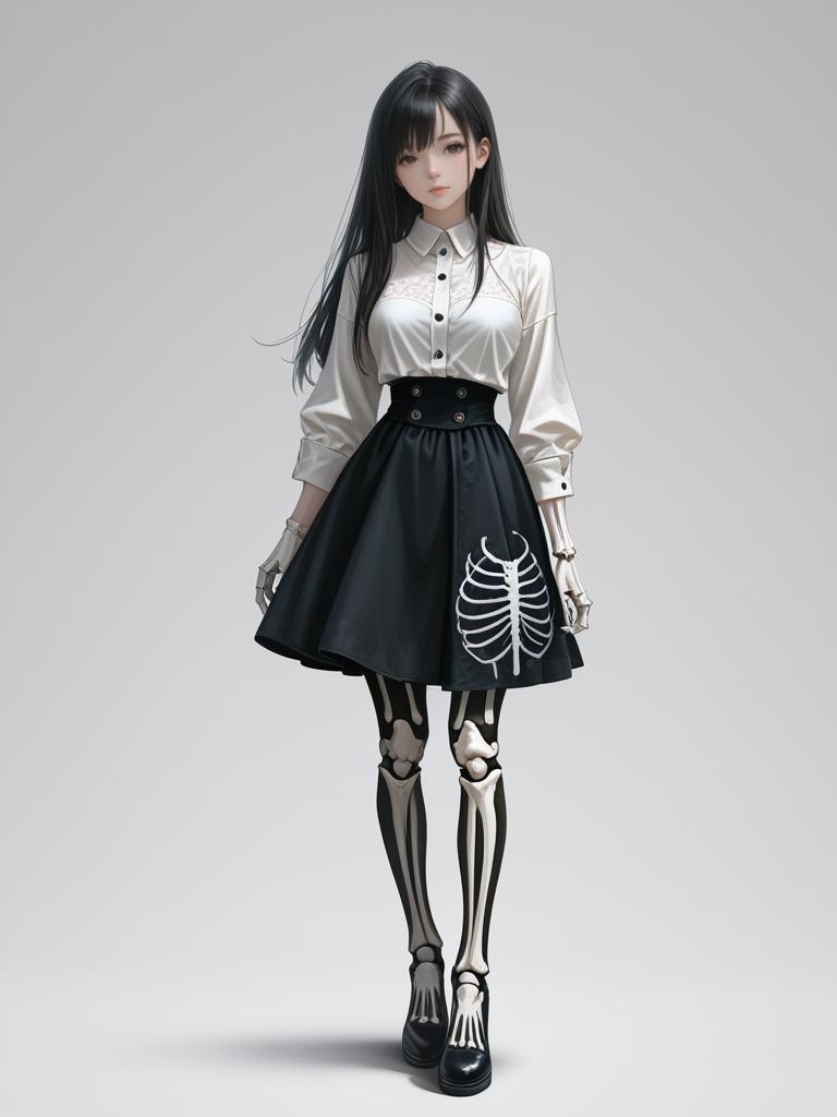 1girl, realistic face, full body shot, Woman, modern edgy, cropped black sleeveless button-up shirt, high-waisted A-line skirt with white skeletal print, structured fabric, mid-thigh length, clean white background