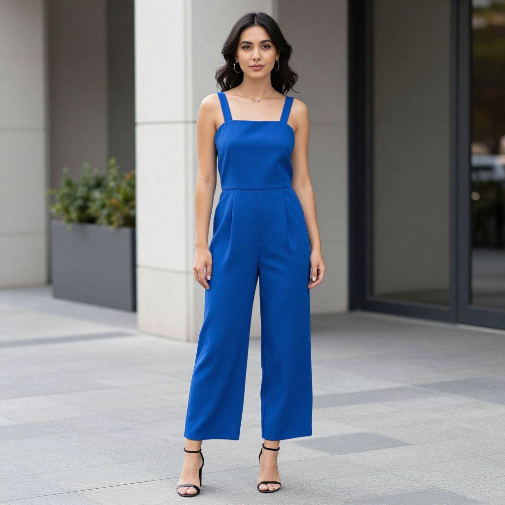 Photograph of a young woman standing outdoors on a gray pavement. She has medium-length, wavy black hair and wears a vibrant royal blue, sleeveless romper with wide straps and loose, cropped pants. She accessorizes with large hoop earrings and black, open-toe high heels. Her skin is light brown, and she has a neutral expression. The background features a modern building with large glass windows and a planter with green plants. The lighting is bright, suggesting daytime. The overall style is contemporary and chic.