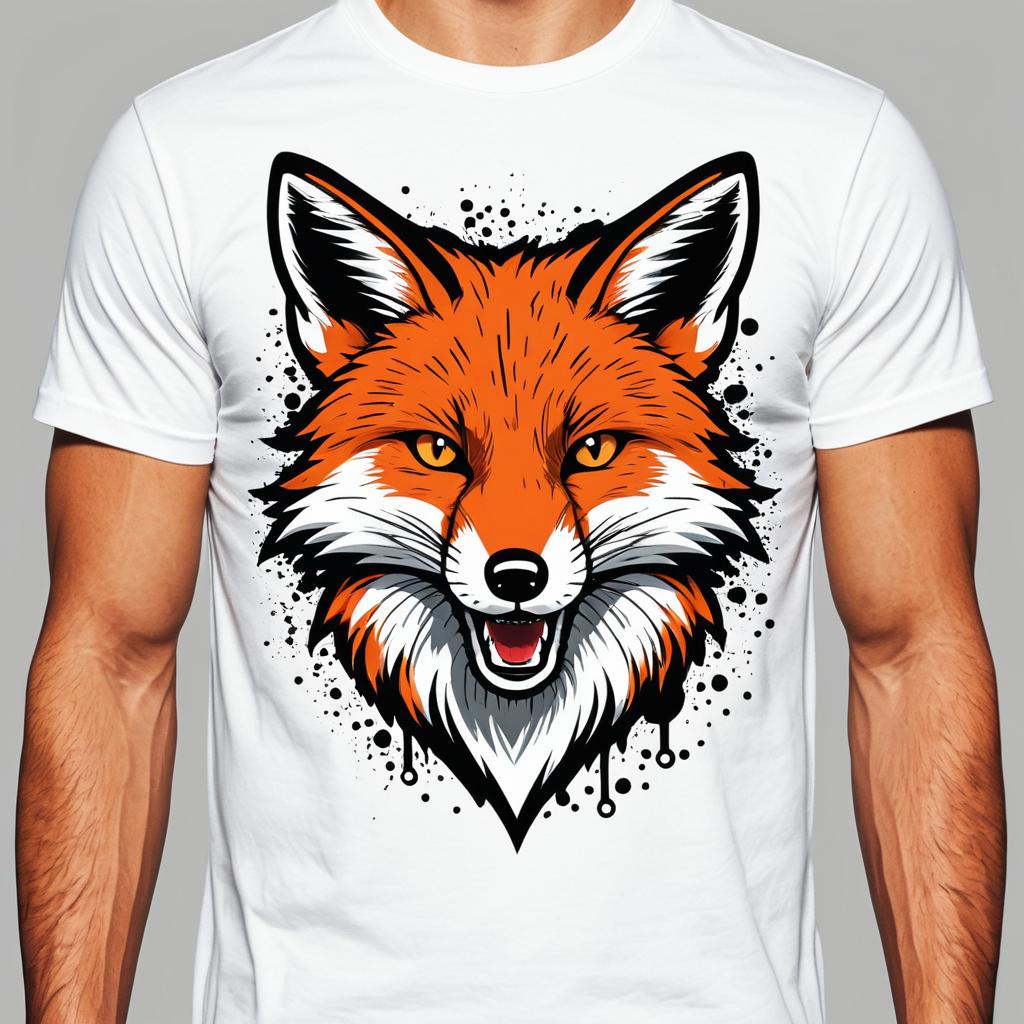 Close-up of a white t-shirt featuring a vibrant cartoon design of a sports wounded fox. The vector illustration highlights the fox head in orange, white, and black with sharp, clean strokes and splattered paint effects around the edges, creating a bold and dynamic flat design suitable for t-shirt printing.