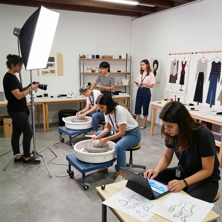An art collective in a warehouse space, with artists working on various projects - a photographer setting up a lighting rig, a ceramicist working at a wheel, a graphic designer on a tablet, and a fashion designer sketching on paper