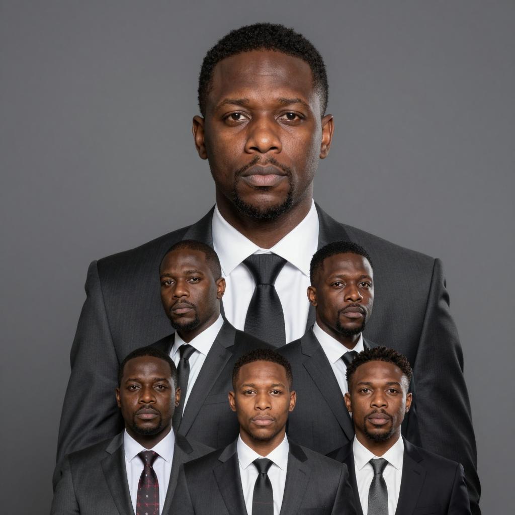 Photograph of a Black man with short hair, wearing a dark suit and tie, centered against a gray gradient background. His expression is serious. Superimposed in the lower half are four smaller images of Black men in various poses. The man in the foreground is larger, the smaller images are layered beneath him.
