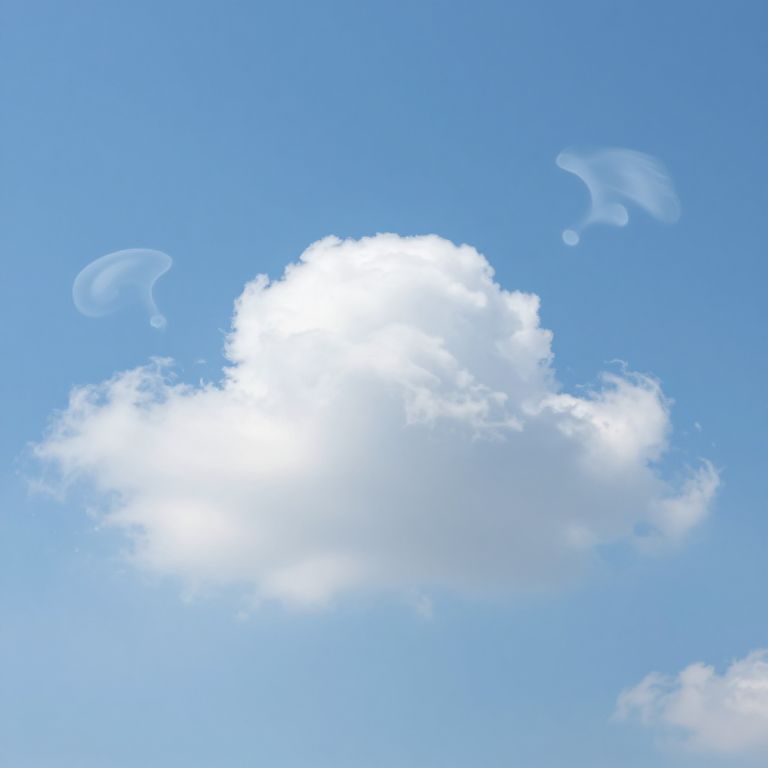 A serene digital artwork depicts a large, fluffy cumulus cloud as the central focus, surrounded by smaller, scattered clouds that appear to exhale delicate, ephemeral shapes into the clear blue sky, evoking a sense of silent communication through subtle, artistic visual effects.