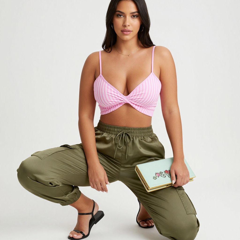 Woman, casual chic, pink striped crop top with spaghetti straps and twisted front detail, olive green satin cargo pants with elastic cuffs, flat black open-toe sandals, holding a pastel green book clutch with floral embellishment, white studio background.. Sexy. Pretty face and beаutiful eyes. Big breasts.
