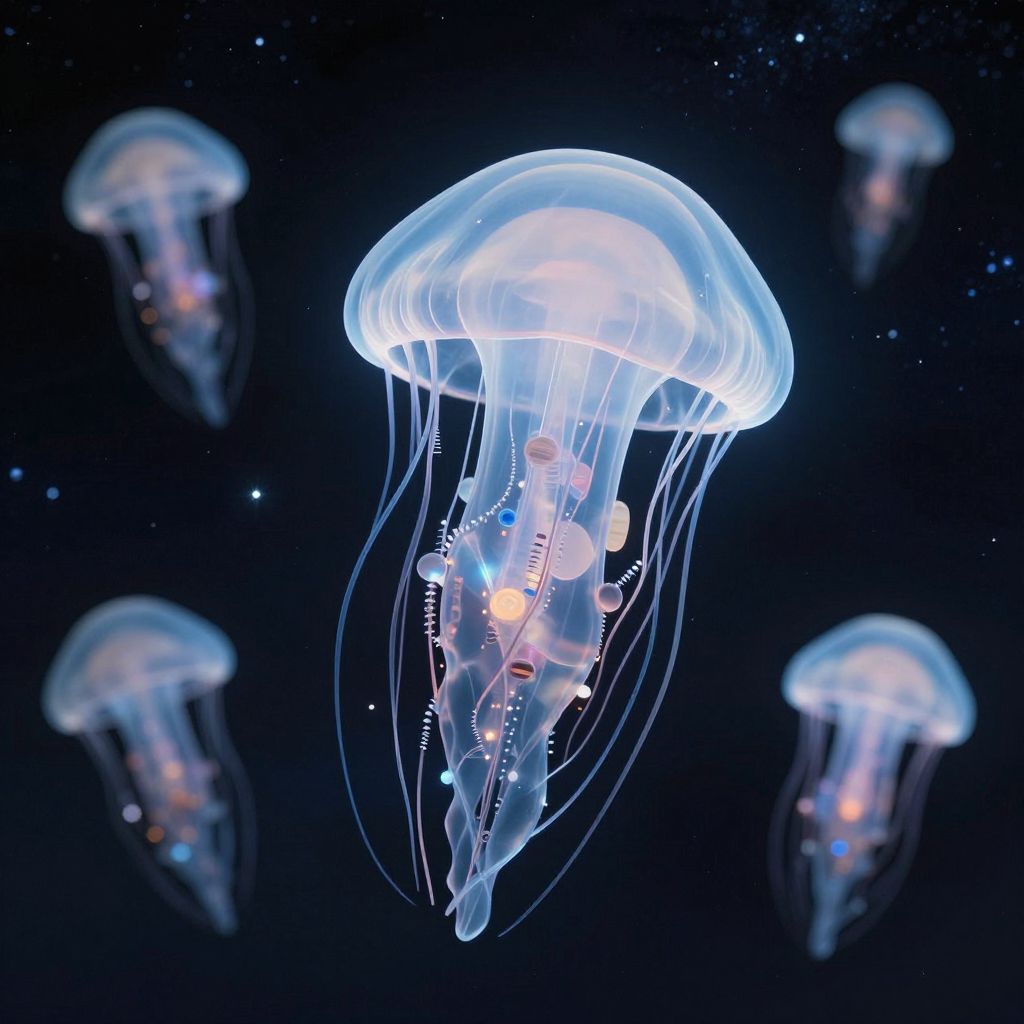 Serenity floats in the cosmos as cities cradle atop ethereal jellyfish, their translucent forms drifting through a starlit expanse, embodying the delicate balance between human ingenuity and the infinite mystery of the universe.
