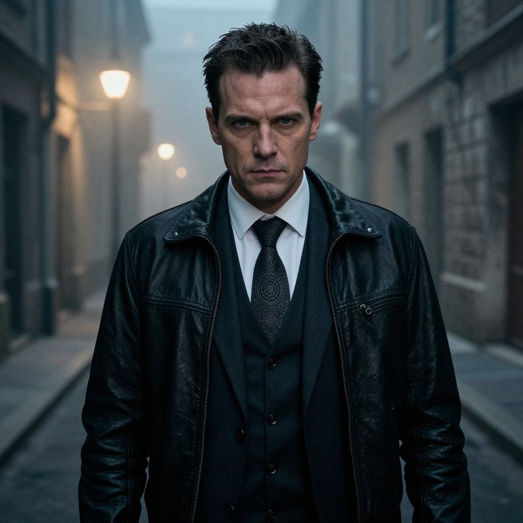 Photograph of a serious-looking man with short, dark hair and intense blue eyes, standing in a foggy, dimly lit alley at night. He's wearing a black leather jacket over a dark, three-piece suit with a white shirt and a black tie featuring a detailed, circular pattern. The alley has blurred street lamps and stone buildings in the background, creating a mysterious, moody atmosphere.
