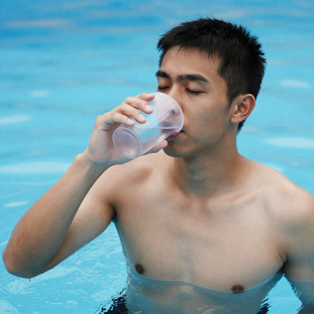 Photograph of a young man with short black hair, medium brown skin, and a lean build, drinking from a clear plastic cup in a pool. He is shirtless, with water droplets on his chest and arms. He has closed eyes and a focused expression. Bright blue pool water fills the background.